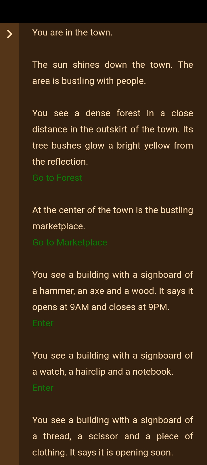 • Explore the woods, the town, or beyond. For now, you can only access the woods and town.